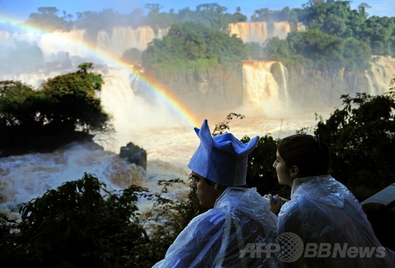 【6月13日 AFP】南米ブラジルのフォス・ド・イグアス(Foz do Iguacu)で12日、世界遺産の「イグアスの滝(Iguazu Falls)」の濁流の上にかかる虹をAFPのカメラが捉えた。イグアスの滝は、上流で降り続いた豪雨の影響で大幅に増水しており、観光用の橋が破損するなどの被害が出ている。