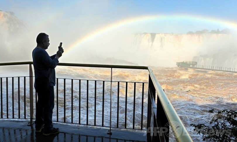 【6月13日 AFP】南米ブラジルのフォス・ド・イグアス(Foz do Iguacu)で12日、世界遺産の「イグアスの滝(Iguazu Falls)」の濁流の上にかかる虹をAFPのカメラが捉えた。イグアスの滝は、上流で降り続いた豪雨の影響で大幅に増水しており、観光用の橋が破損するなどの被害が出ている。
