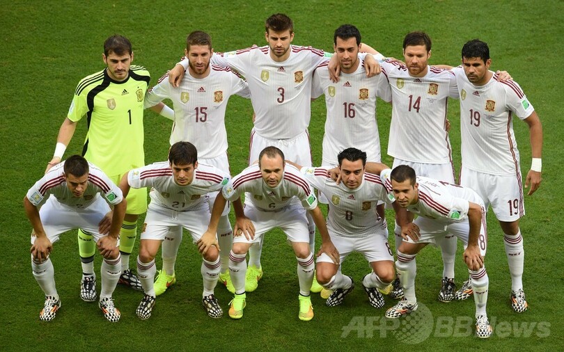 前半にペナルティーエリア内でデ・フレイとの接触でジエゴ・コスタ(Diego da Silva Costa)が転倒して得たPKをシャビ・アロンソ(Xabi Alonso)が決めて先制したスペインだったが、5失点を喫して過去半世紀で最悪の結果に終わった。(c)AFP