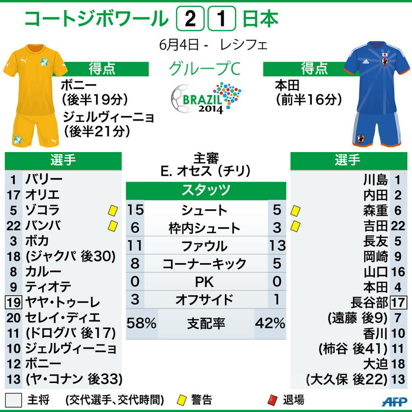 ワールドカップ 日本人選手 図解 【図解】コートジボワール対日本のスタッツ 2014年6月15日 15:12 発信地:その他 [ 例外 その他 ] このニュースをシェア サッカーW杯ブラジル大会(2014 World Cup)グループC、コートジボワール対日本。結果と試合のスタッツをまとめた表(2014年6月14日作成)。(c)AFP/Paz Pizzaro 【6月15日 AFP】サッカーW杯ブラジル大会(2014 World Cup)グループC、コートジボワール対日本。結果と試合のスタッツをまとめた表。(c)AFP ワールドカップ 一覧へ> メディア・報道関係・法人の方向け 写真・動画 購入のお問合せ>