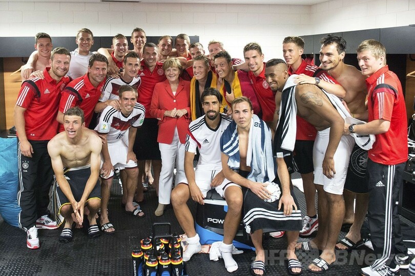 メルケル首相は、代表チームの試合後には必ず、メンバーの元を訪れている。2006年のサッカーW杯ドイツ大会の開催時には、熱狂的にチームを応援する首相の姿が日刊紙ビルト(Bild)に掲載され、首相の支持率は急上昇した。(c)AFP