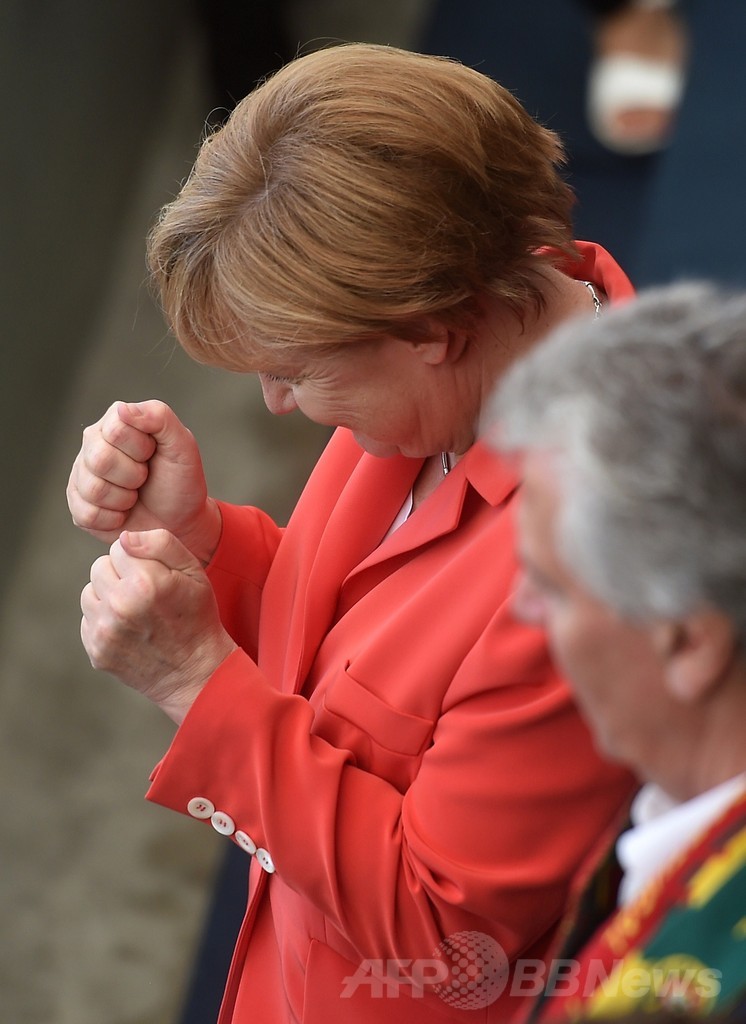 メルケル首相は、代表チームの試合後には必ず、メンバーの元を訪れている。2006年のサッカーW杯ドイツ大会の開催時には、熱狂的にチームを応援する首相の姿が日刊紙ビルト(Bild)に掲載され、首相の支持率は急上昇した。(c)AFP