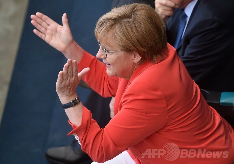 メルケル首相は、代表チームの試合後には必ず、メンバーの元を訪れている。2006年のサッカーW杯ドイツ大会の開催時には、熱狂的にチームを応援する首相の姿が日刊紙ビルト(Bild)に掲載され、首相の支持率は急上昇した。(c)AFP