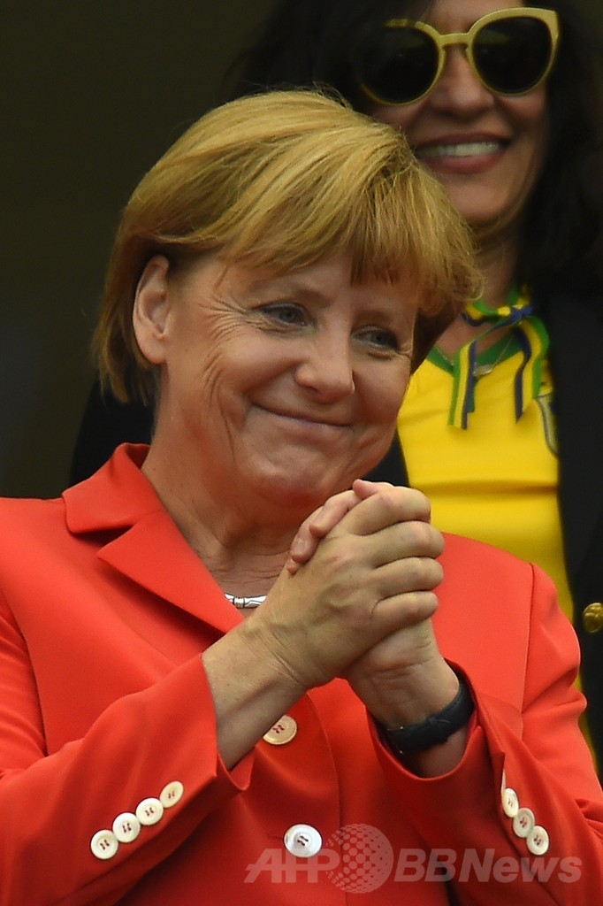 メルケル首相は、代表チームの試合後には必ず、メンバーの元を訪れている。2006年のサッカーW杯ドイツ大会の開催時には、熱狂的にチームを応援する首相の姿が日刊紙ビルト(Bild)に掲載され、首相の支持率は急上昇した。(c)AFP