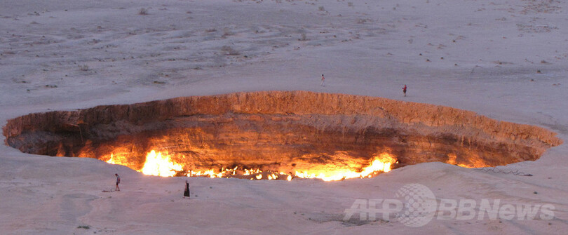 【6月23日 AFP】トルクメニスタンにあるカラクム(Karakum)砂漠の中央部には、天然ガスが延々と燃えさかる巨大なクレーターが存在する。