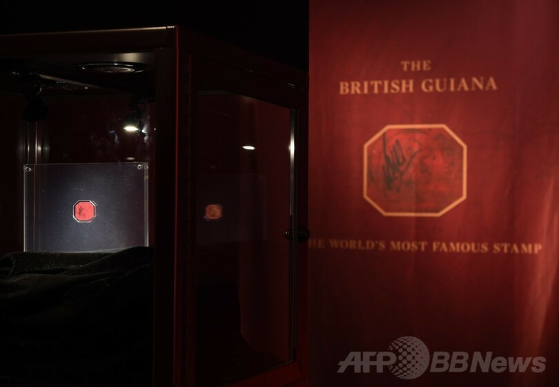 落札されたのは、英植民地時代のガイアナで1856 年に発行された赤紫色の1セント切手。縦2.54センチ、横3.18センチの八角形で、郵便局長のイニシャルが入っている。競売を主催した競売大手サザビーズ(Sotheby's)のデービッド・レッデン(David Redden)氏によると、入札は450万ドル(約4億6000万円)から始まり、わずか2分後に電話で参加した匿名の入札者によって落札された。(c)AFP/Jennie MATTHEW