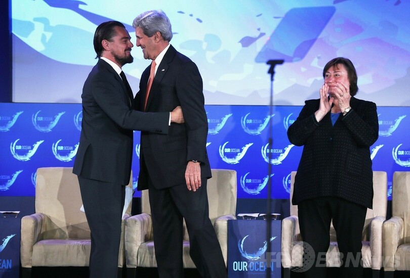 米俳優のレオナルド・ディカプリオ(Leonardo DiCaprio)さんも会議に参加し、海の環境の保全活動のために自身が設立した財団から700万ドル(約7億2000万円)を拠出すると発表した。(c)AFP/Jo Biddle