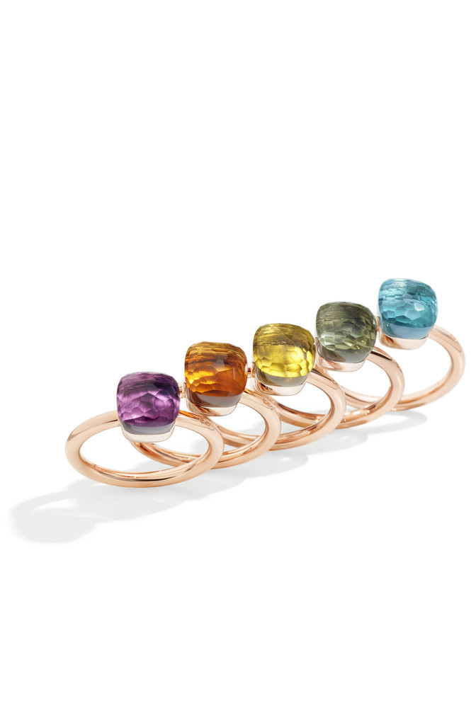 「ヌード」は「ポメラート」のシンボル的存在であるジュエリーコレクション。いつもの「ヌード」をそのままミニサイズに仕上げたプチバージョンは、ローズゴールドとホワイトゴールドをベースに、ブルートバーズ、アメシスト、マデラクォーツ、プラシオライト、レモンクォーツの5色のストーンで展開。クラシックやマキシバージョンと同様に、数ある組み合わせの中から自分にふさわしいリングを見つけることができる。価格は各17万6000円(税抜)。