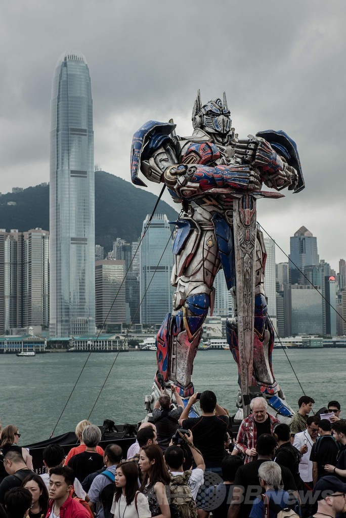 【6月20日 AFP】香港(Hong Kong)で19日、映画『トランスフォーマー/ロストエイジ(Transformers: Age of Extinction)』のワールドプレミアを記念して、高さ20フィート(約6.1メートル)のオプティマスプライム(Optimus Prime)のフィギュアが設置された。同映画の一部は香港で撮影されている。(c)AFP
