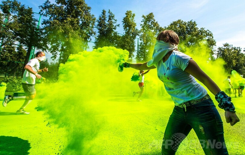 【6月22日 AFP】モスクワ(Moscow)市内のルジニキ・オリンピック・コンプレックス(Luzhniki Olympic Complex)で21日、カラーバウダーを浴びながら5キロを走るイベント「カラーラン(Colour Run)」が行われ、参加者らは鮮やかな色に染まりながらランニングを楽しんでいた。(c)AFP