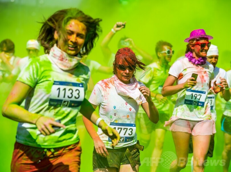 【6月22日 AFP】モスクワ(Moscow)市内のルジニキ・オリンピック・コンプレックス(Luzhniki Olympic Complex)で21日、カラーバウダーを浴びながら5キロを走るイベント「カラーラン(Colour Run)」が行われ、参加者らは鮮やかな色に染まりながらランニングを楽しんでいた。(c)AFP