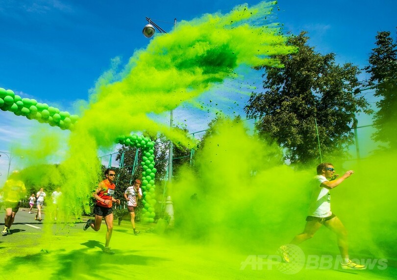 【6月22日 AFP】モスクワ(Moscow)市内のルジニキ・オリンピック・コンプレックス(Luzhniki Olympic Complex)で21日、カラーバウダーを浴びながら5キロを走るイベント「カラーラン(Colour Run)」が行われ、参加者らは鮮やかな色に染まりながらランニングを楽しんでいた。(c)AFP