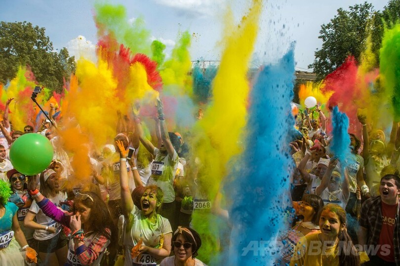 【6月22日 AFP】モスクワ(Moscow)市内のルジニキ・オリンピック・コンプレックス(Luzhniki Olympic Complex)で21日、カラーバウダーを浴びながら5キロを走るイベント「カラーラン(Colour Run)」が行われ、参加者らは鮮やかな色に染まりながらランニングを楽しんでいた。(c)AFP