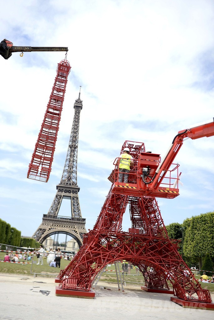 【6月24日 AFP】フランスの首都パリ(Paris)で23日、椅子を積み上げて作られたエッフェル塔(Eiffel Tower)のレプリカが登場した。使われた椅子は、仏家具メーカー「フェルモブ(Fermob)」の人気コレクション「ビストロ(Bistro)」で、エッフェル塔と同様、誕生から今年で125年を迎えた。(c)AFP