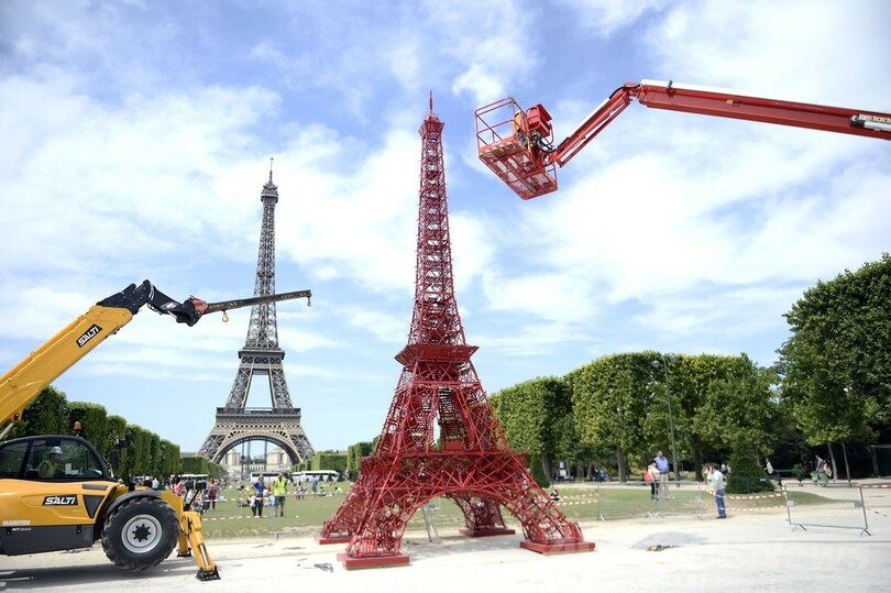 【6月24日 AFP】フランスの首都パリ(Paris)で23日、椅子を積み上げて作られたエッフェル塔(Eiffel Tower)のレプリカが登場した。使われた椅子は、仏家具メーカー「フェルモブ(Fermob)」の人気コレクション「ビストロ(Bistro)」で、エッフェル塔と同様、誕生から今年で125年を迎えた。(c)AFP