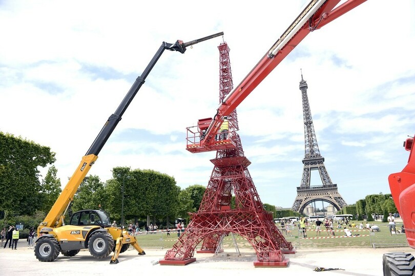 【6月24日 AFP】フランスの首都パリ(Paris)で23日、椅子を積み上げて作られたエッフェル塔(Eiffel Tower)のレプリカが登場した。使われた椅子は、仏家具メーカー「フェルモブ(Fermob)」の人気コレクション「ビストロ(Bistro)」で、エッフェル塔と同様、誕生から今年で125年を迎えた。(c)AFP