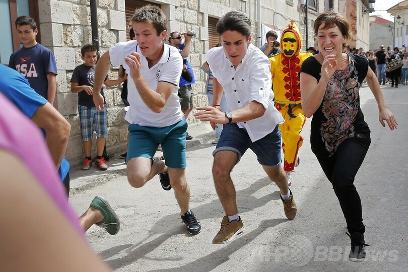 【6月25日 AFP】スペイン北部ブルゴス(Burgos)近郊の村、カストリージョ・デ・ムルシア(Castrillo de Murcia)で22日、カトリックの「聖体祭(Corpus Christi)」を祝う伝統行事「エル・コラチョ(El Colacho)」が行われた。路上に寝かせた赤ちゃんの上を悪魔に扮(ふん)した男たちが飛び越える毎年恒例のこの行事は、その起源を1620年にまでさかのぼる。(c)AFP