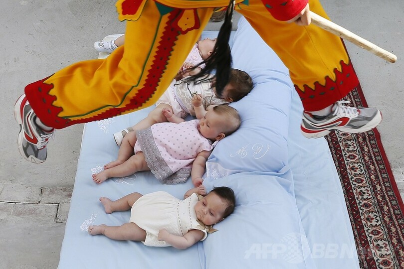 【6月25日 AFP】スペイン北部ブルゴス(Burgos)近郊の村、カストリージョ・デ・ムルシア(Castrillo de Murcia)で22日、カトリックの「聖体祭(Corpus Christi)」を祝う伝統行事「エル・コラチョ(El Colacho)」が行われた。路上に寝かせた赤ちゃんの上を悪魔に扮(ふん)した男たちが飛び越える毎年恒例のこの行事は、その起源を1620年にまでさかのぼる。(c)AFP