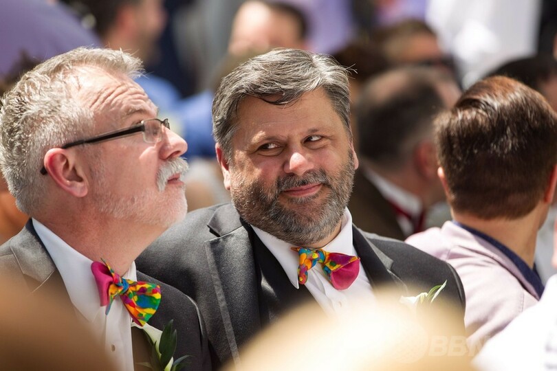 異国でドラマチックな瞬間を迎え、感情の高まったガンサーさんとラスレットさんは、いつかは自分たちの結婚が母国でも認められる日が来ると信じたいとし、「母国に帰った後、たとえ私たちの結婚が認められなくても、私たちはお互いを夫と呼ぶよ」と述べた。