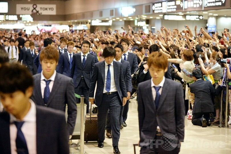【6月27日 AFP】サッカーW杯ブラジル大会(2014 World Cup)でグループリーグ敗退に終わった日本代表が27日、帰国し成田空港(Narita Airport)に到着した。空港には大勢のファンが詰め掛け、選手たちを出迎えた。(c)AFP