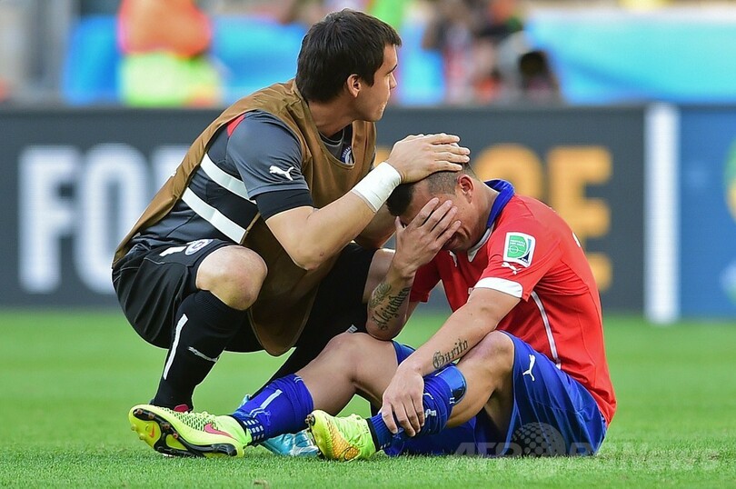 W杯でのブラジルの悪夢を拭い去ることができなかったチリは、1998年フランス大会、2010年南アフリカ大会(2010 World Cup)に続き、またもブラジルに8強入りを阻まれた。(c)AFP/Andy SCOTT