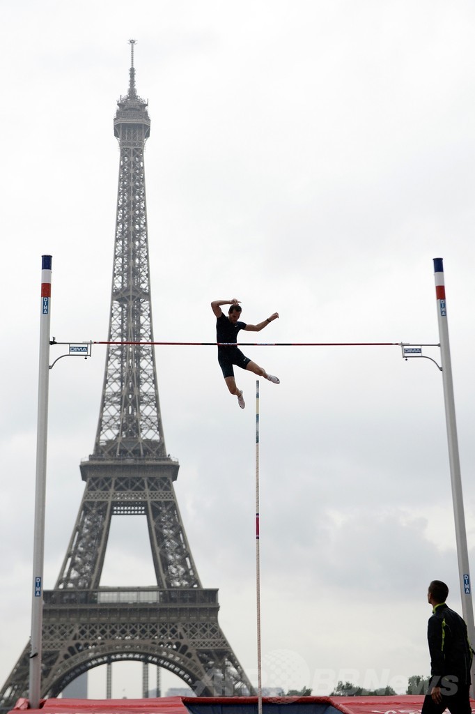 【6月29日 AFP】パリ(Paris)のエッフェル塔(Eiffel Tower)前で28日、棒高跳びのイベントが開催され、世界記録保持者のフランス人選手、ルノー・ラビレニ(Renaud Lavillenie)らが跳躍を披露した。(c)AFP