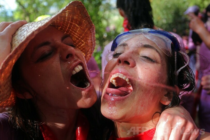 【6月30日 AFP】スペインを代表するワインの産地、ラ・リオハ(La Rioja)州アーロ(Haro)で29日、伝統の祭り「バターリャ・デル・ビーノ (Batalla del vino) 」が行われ、地元の人や観光客が水鉄砲などで盛大にワインをかけ合った。祭りには9000人以上が参加し、約13万リットルのワインが使われた。(c)AFP