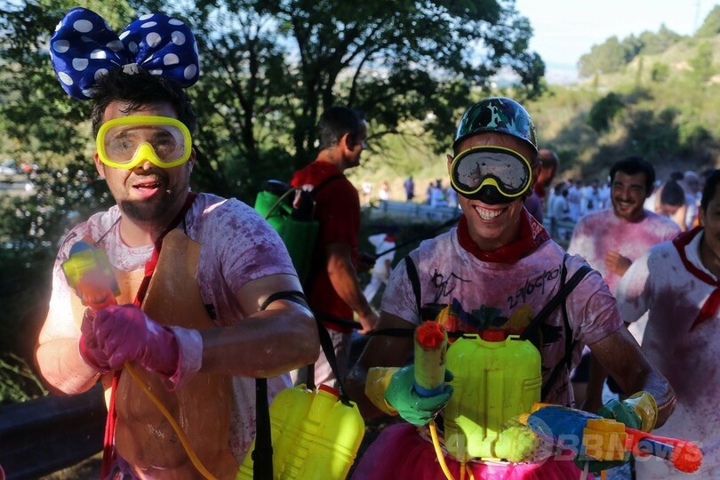 【6月30日 AFP】スペインを代表するワインの産地、ラ・リオハ(La Rioja)州アーロ(Haro)で29日、伝統の祭り「バターリャ・デル・ビーノ (Batalla del vino) 」が行われ、地元の人や観光客が水鉄砲などで盛大にワインをかけ合った。祭りには9000人以上が参加し、約13万リットルのワインが使われた。(c)AFP