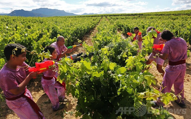 【6月30日 AFP】スペインを代表するワインの産地、ラ・リオハ(La Rioja)州アーロ(Haro)で29日、伝統の祭り「バターリャ・デル・ビーノ (Batalla del vino) 」が行われ、地元の人や観光客が水鉄砲などで盛大にワインをかけ合った。祭りには9000人以上が参加し、約13万リットルのワインが使われた。(c)AFP
