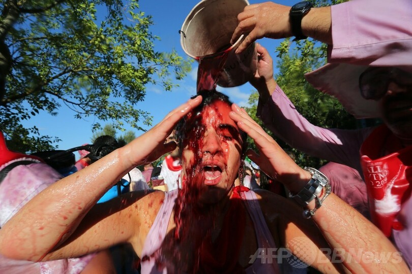 【6月30日 AFP】スペインを代表するワインの産地、ラ・リオハ(La Rioja)州アーロ(Haro)で29日、伝統の祭り「バターリャ・デル・ビーノ (Batalla del vino) 」が行われ、地元の人や観光客が水鉄砲などで盛大にワインをかけ合った。祭りには9000人以上が参加し、約13万リットルのワインが使われた。(c)AFP