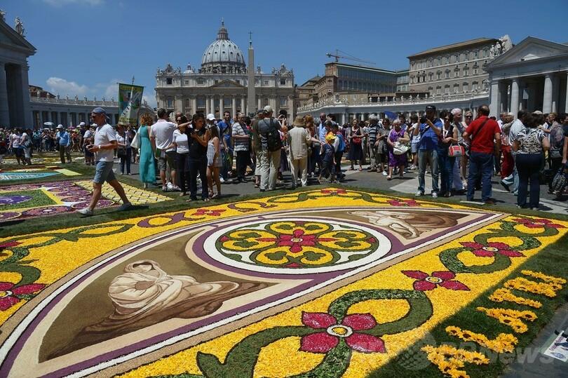 【6月30日 AFP】バチカン市国で29日、花じゅうたんの祭り「インフィオラータ(infiorata)」が開かれ、サンピエトロ大聖堂(St Peter's Basilica)前の道路には、50の絵柄が描かれた。祭りでは花50万本、塩2トン、色付けされたおがくず100袋が使われた。