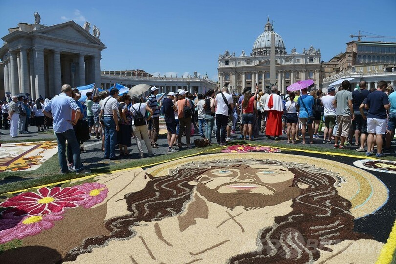 【6月30日 AFP】バチカン市国で29日、花じゅうたんの祭り「インフィオラータ(infiorata)」が開かれ、サンピエトロ大聖堂(St Peter's Basilica)前の道路には、50の絵柄が描かれた。祭りでは花50万本、塩2トン、色付けされたおがくず100袋が使われた。