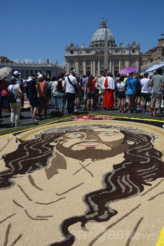 【6月30日 AFP】バチカン市国で29日、花じゅうたんの祭り「インフィオラータ(infiorata)」が開かれ、サンピエトロ大聖堂(St Peter's Basilica)前の道路には、50の絵柄が描かれた。祭りでは花50万本、塩2トン、色付けされたおがくず100袋が使われた。