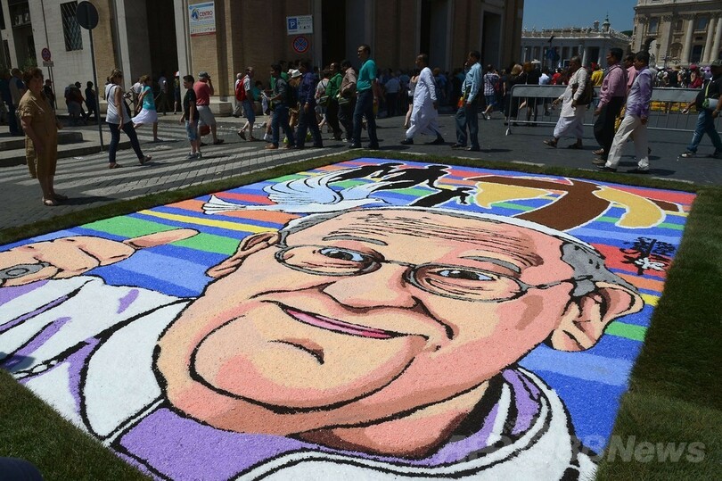 【6月30日 AFP】バチカン市国で29日、花じゅうたんの祭り「インフィオラータ(infiorata)」が開かれ、サンピエトロ大聖堂(St Peter's Basilica)前の道路には、50の絵柄が描かれた。祭りでは花50万本、塩2トン、色付けされたおがくず100袋が使われた。
