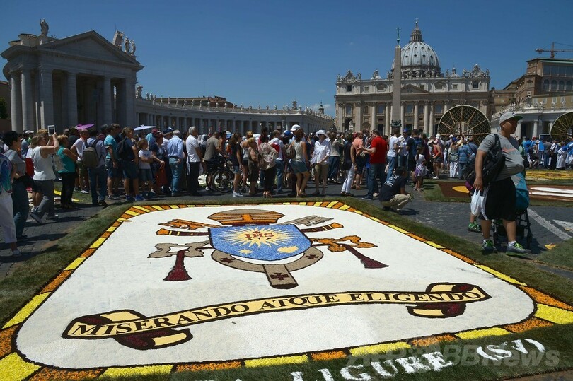 【6月30日 AFP】バチカン市国で29日、花じゅうたんの祭り「インフィオラータ(infiorata)」が開かれ、サンピエトロ大聖堂(St Peter's Basilica)前の道路には、50の絵柄が描かれた。祭りでは花50万本、塩2トン、色付けされたおがくず100袋が使われた。