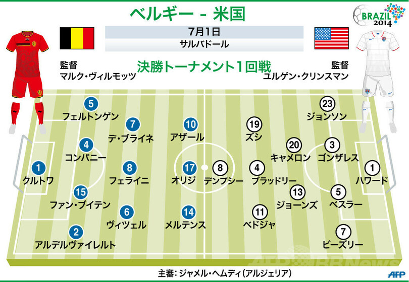 【7月2日 AFP】サルバドール(Salvador)行われるサッカーW杯ブラジル大会(2014 World Cup)決勝トーナメント1回戦、ベルギー対米国の先発メンバーが発表された。