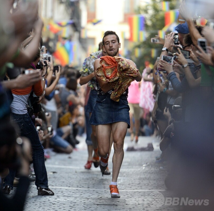 【7月4日 AFP】スペイン・マドリード(Madrid)のチュエカ(Chueca)で3日、LGBT(レズビアン、ゲイ、バイセクシュアル、トランスジェンダー)の祭典「マドリード・プライド(Madrid Pride、MADO)」の一環としてハイヒールレースが行われ、ドラァグクイーンらが参加した。