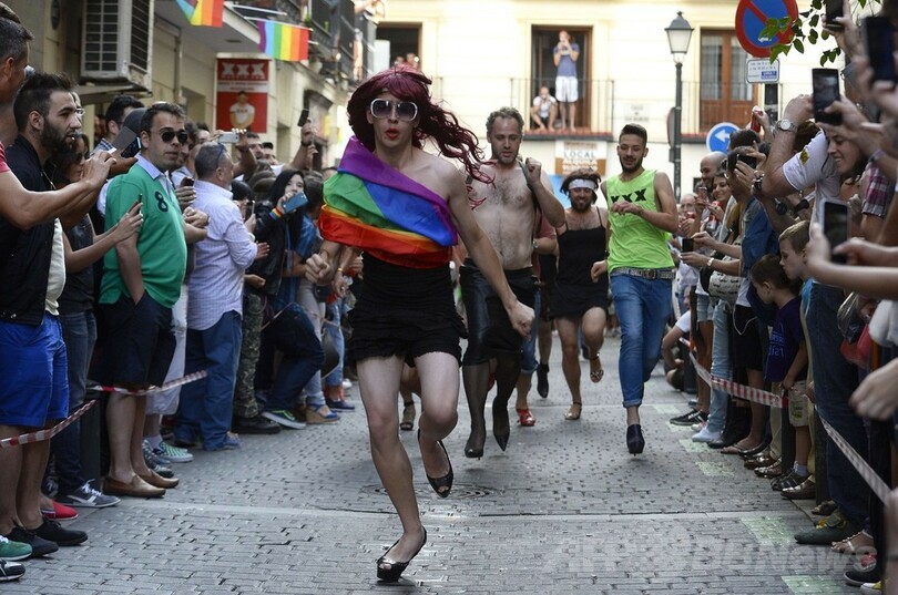【7月4日 AFP】スペイン・マドリード(Madrid)のチュエカ(Chueca)で3日、LGBT(レズビアン、ゲイ、バイセクシュアル、トランスジェンダー)の祭典「マドリード・プライド(Madrid Pride、MADO)」の一環としてハイヒールレースが行われ、ドラァグクイーンらが参加した。