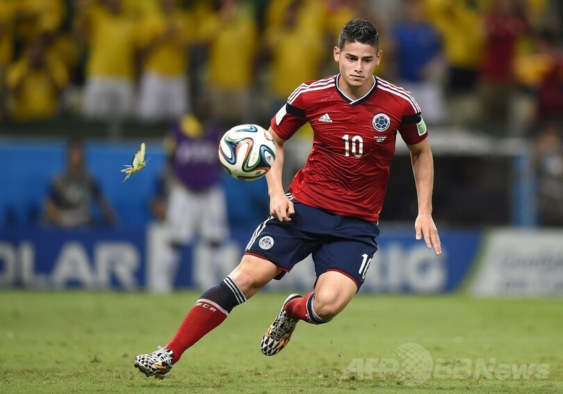 【7月5日 AFP】フォルタレーザ(Fortaleza)で行われたサッカーW杯ブラジル大会(2014 World Cup)準々決勝、ブラジル対コロンビアの試合中、コロンビアのハメス・ロドリゲス(James Rodriguez)の腕にバッタがついた。(c)AFP