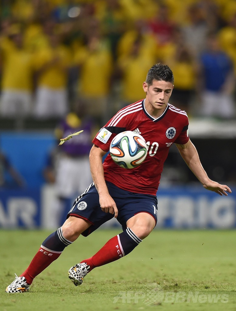 【7月5日 AFP】フォルタレーザ(Fortaleza)で行われたサッカーW杯ブラジル大会(2014 World Cup)準々決勝、ブラジル対コロンビアの試合中、コロンビアのハメス・ロドリゲス(James Rodriguez)の腕にバッタがついた。(c)AFP