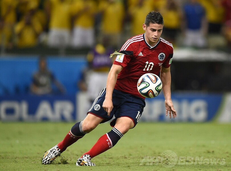【7月5日 AFP】フォルタレーザ(Fortaleza)で行われたサッカーW杯ブラジル大会(2014 World Cup)準々決勝、ブラジル対コロンビアの試合中、コロンビアのハメス・ロドリゲス(James Rodriguez)の腕にバッタがついた。(c)AFP