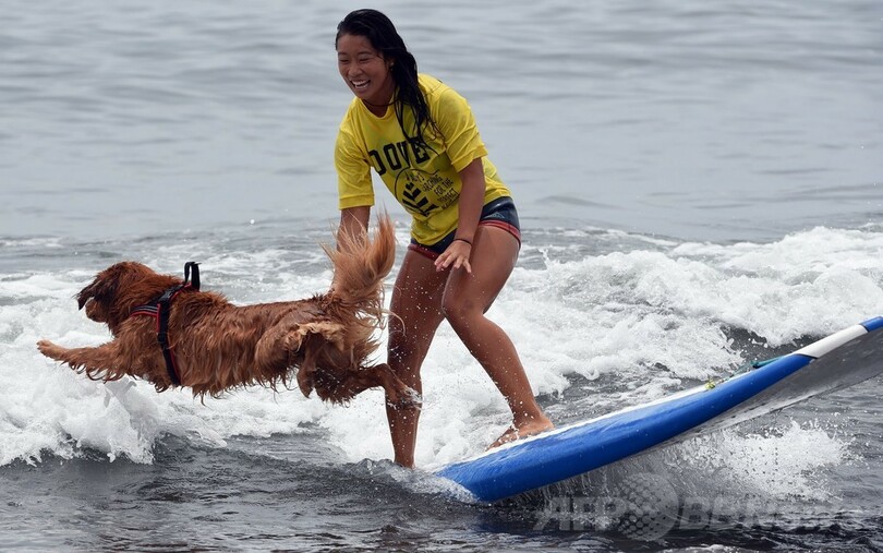 【7月7日 AFP】神奈川県藤沢市の辻堂海岸で6日、サーフィンコンテスト「マーボロイヤルKJカップ(Mabo Royal KJ Cup)」の一環として、犬とサーファーがペアで参加する競技が行われ、参加者らが愛犬と一緒に波乗り技を披露した。(c)AFP