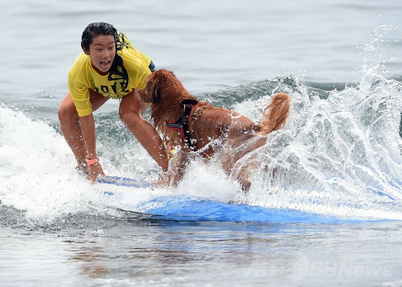 【7月7日 AFP】神奈川県藤沢市の辻堂海岸で6日、サーフィンコンテスト「マーボロイヤルKJカップ(Mabo Royal KJ Cup)」の一環として、犬とサーファーがペアで参加する競技が行われ、参加者らが愛犬と一緒に波乗り技を披露した。(c)AFP