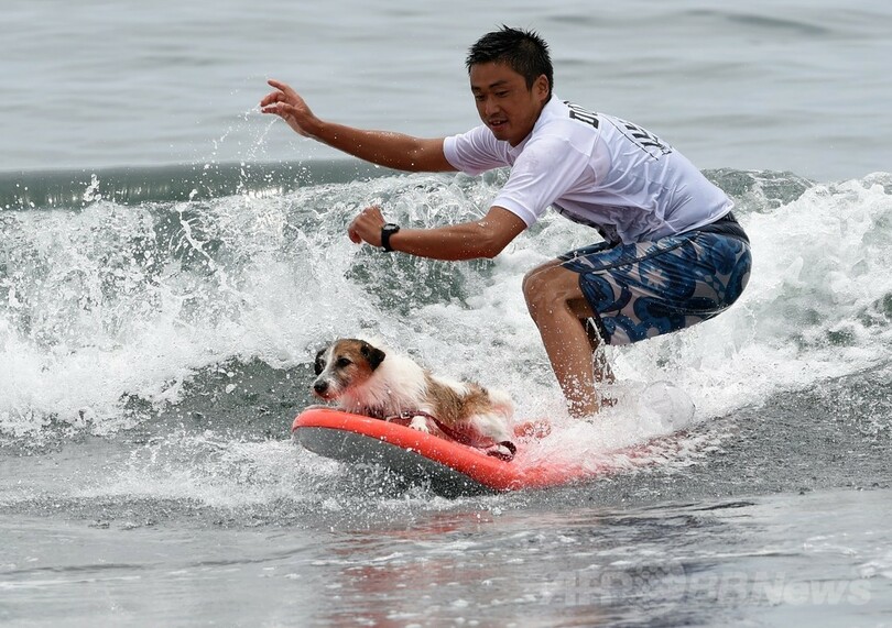 【7月7日 AFP】神奈川県藤沢市の辻堂海岸で6日、サーフィンコンテスト「マーボロイヤルKJカップ(Mabo Royal KJ Cup)」の一環として、犬とサーファーがペアで参加する競技が行われ、参加者らが愛犬と一緒に波乗り技を披露した。(c)AFP