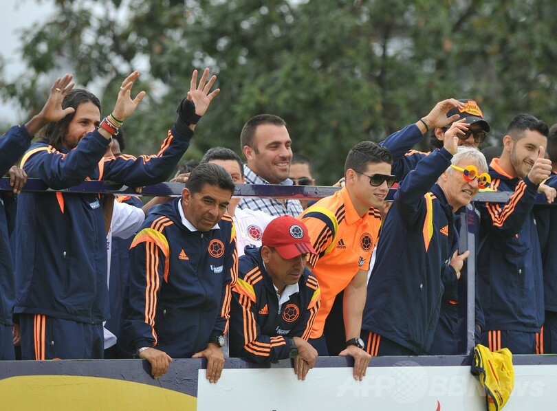 【7月7日 AFP】サッカーW杯ブラジル大会(2014 World Cup)で、初のベスト8入りを果たしたコロンビア代表が6日に帰国し、ボゴタ(Bogota)では、凱旋した英雄の姿をひと目見ようとする多数のファンで通りが埋め尽くされた。