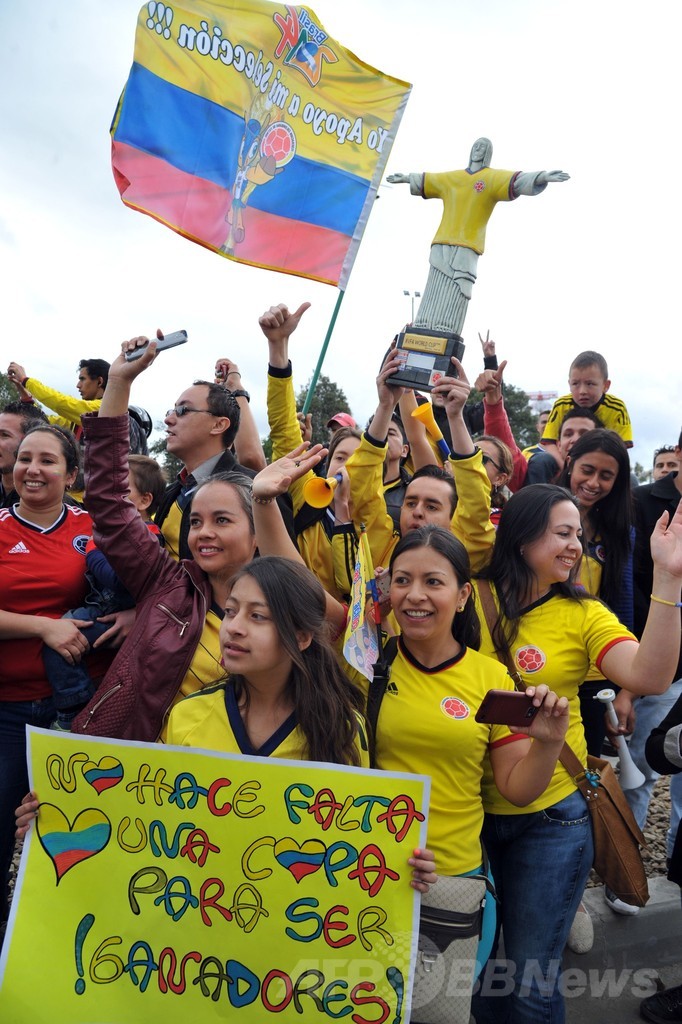【7月7日 AFP】サッカーW杯ブラジル大会(2014 World Cup)で、初のベスト8入りを果たしたコロンビア代表が6日に帰国し、ボゴタ(Bogota)では、凱旋した英雄の姿をひと目見ようとする多数のファンで通りが埋め尽くされた。