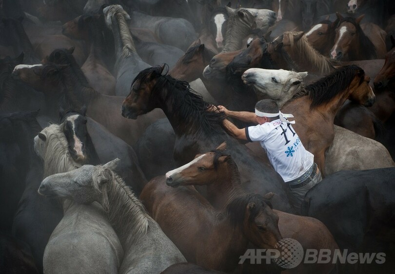 【7月7日 AFP】スペイン北西部サンティアゴデコンポステラ(Santiago de Compostela)から40キロほど離れたサブセド(Sabucedo)村で5日、約400年の歴史を持つ馬の祭り「ラパ・ダス・ベスタス(Rapa Das Bestas、野獣の毛刈りの意)」が行われた。近隣の山林に生息する野生馬数百頭が集められ、囲いに追い込まれると体毛を刈られ、毛づくろいがされた。(c)AFP