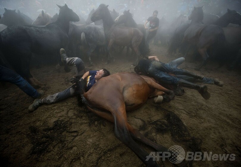 「野獣の毛刈り」祭り、野生の馬を追い込む男性たち スペイン