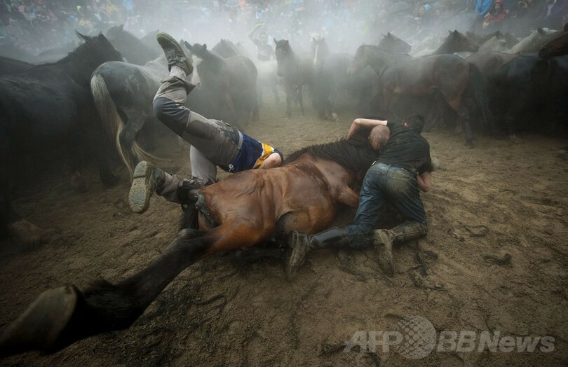【7月7日 AFP】スペイン北西部サンティアゴデコンポステラ(Santiago de Compostela)から40キロほど離れたサブセド(Sabucedo)村で5日、約400年の歴史を持つ馬の祭り「ラパ・ダス・ベスタス(Rapa Das Bestas、野獣の毛刈りの意)」が行われた。近隣の山林に生息する野生馬数百頭が集められ、囲いに追い込まれると体毛を刈られ、毛づくろいがされた。(c)AFP