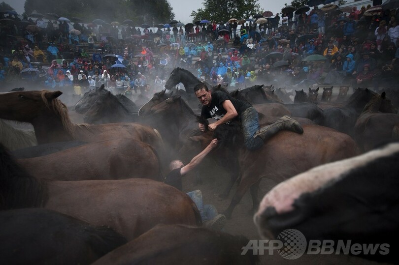 【7月7日 AFP】スペイン北西部サンティアゴデコンポステラ(Santiago de Compostela)から40キロほど離れたサブセド(Sabucedo)村で5日、約400年の歴史を持つ馬の祭り「ラパ・ダス・ベスタス(Rapa Das Bestas、野獣の毛刈りの意)」が行われた。近隣の山林に生息する野生馬数百頭が集められ、囲いに追い込まれると体毛を刈られ、毛づくろいがされた。(c)AFP